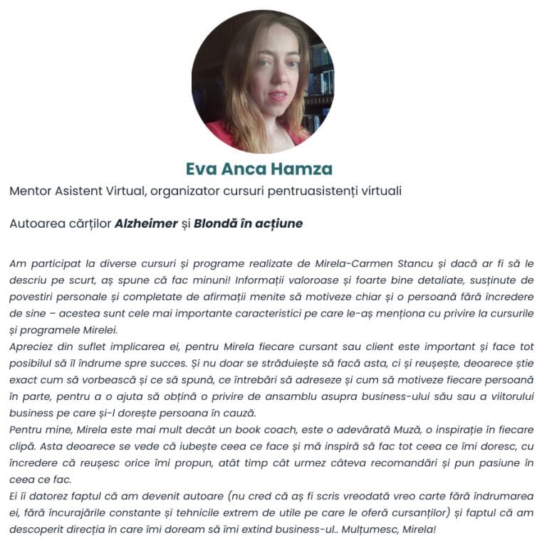 Pe lângă multiplele calificări ce îi deservesc pe cei care doresc să-și transmită mesajul folosind puterea cuvântului scris, adevărata mea specializare este să mă conectez cu sufletul omului, astfel încât, să-i dezvăluim împreună geniul și expertiza și, în plus, să-l ajut s-o aștearnă în cuvinte pe hârtie. Și, nu fac asta la voia întâmplării ci creând un spațiu în care viitorii autori trec prin tot procesul de scriere și publicare a cărții lor într-un mod cât mai simplu cu putință, fără a-și pierde motivația, încrederea și inspirația pe parcurs și fără să se simtă pierduți în proces.
