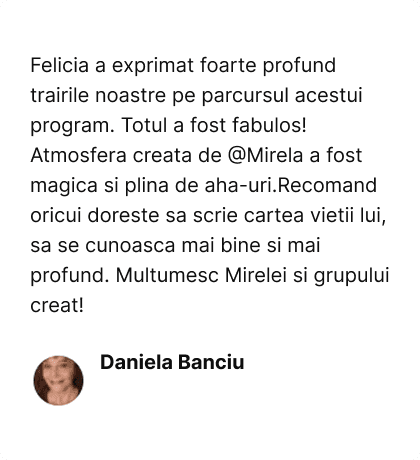 Din acel moment, misiunea mea este să îi ghidez pe oamenii care simt că au o poveste care îi apasă, îi cheamă sau îi urmărește – să o transforme într-o carte autentică, profundă și scrisă cu responsabilitate. Îi ajut să scrie și să editeze. Să-și clarifice vocea, fără să se piardă în proces. Și, nu în ultimul rând, să simtă, în fiecare etapă, că nu sunt singuri.