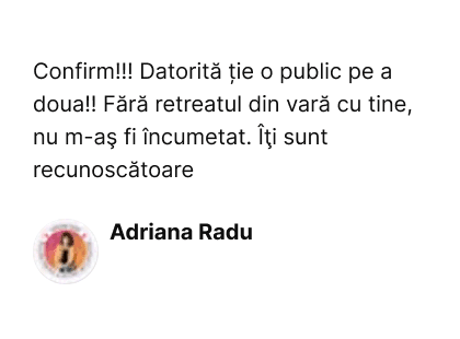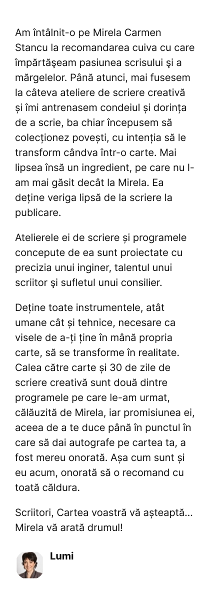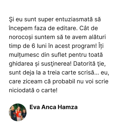De ce fac ceea ce fac? Pentru că și eu am rătăcit ani întregi încercând să scriu și să public singură. Am crezut că trebuie „să mă descurc”, că doar eu trebuie să știu drumul. M-am lovit de nesiguranță, de critici, de blocaje. De frica aceea care îți spune: „Cine te crezi tu să scrii o carte?”